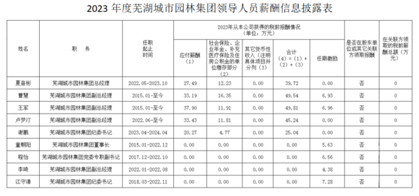 2023年度蕪湖城市園林集團(tuán)領(lǐng)導(dǎo)人員薪酬信息披露表