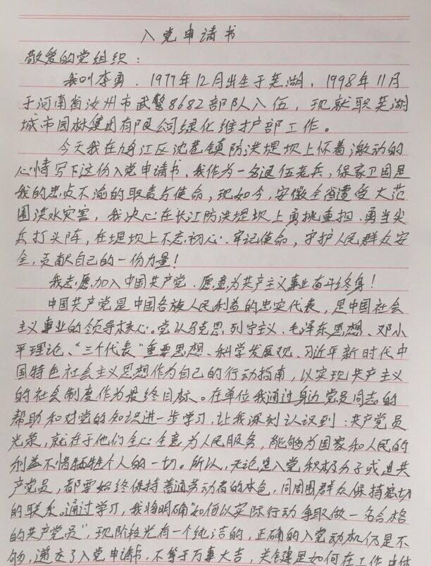 三、防汛大堤上的入黨申請書