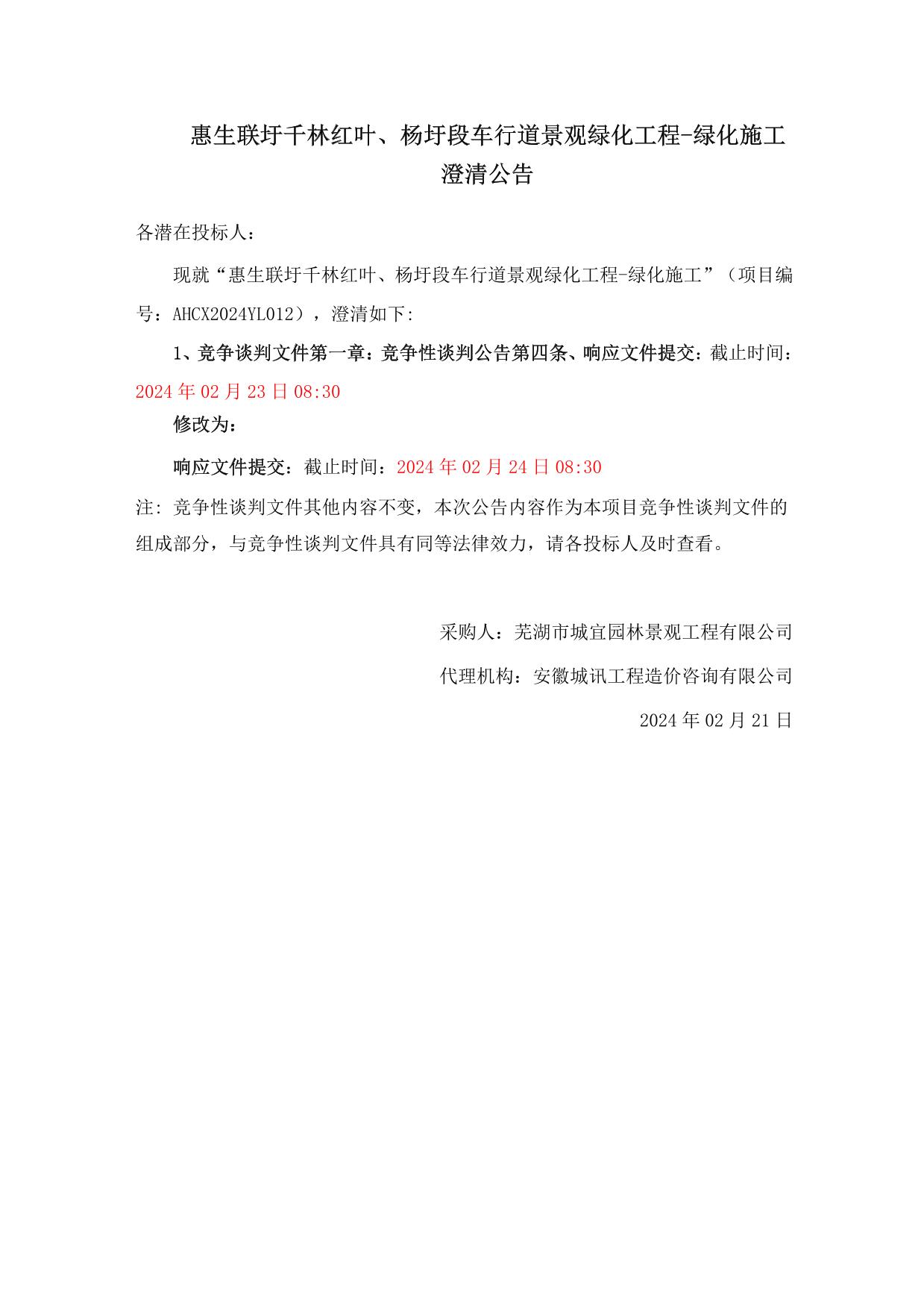 惠生聯(lián)圩千林紅葉、楊圩段車行道景觀綠化工程-綠化施工澄清公告