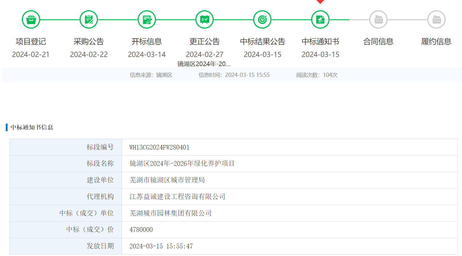 2024年3月,蕪湖城市園林集團(tuán)中標(biāo)鏡湖區(qū)2024年-2026年綠化養(yǎng)護(hù)項(xiàng)目,中標(biāo)總價(jià)1434萬元,合同期為3年。