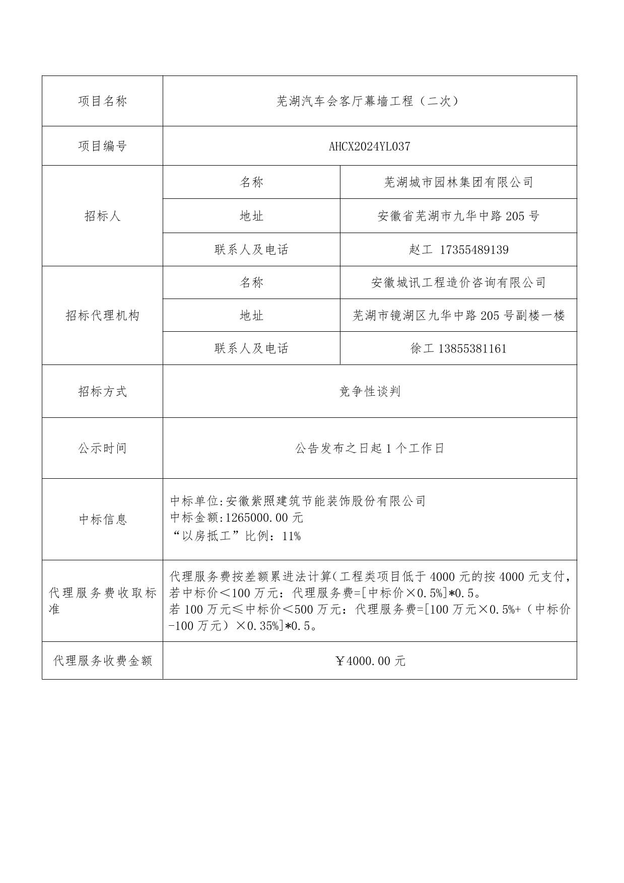 蕪湖汽車會(huì)客廳幕墻工程(二次)中標(biāo)結(jié)果公告